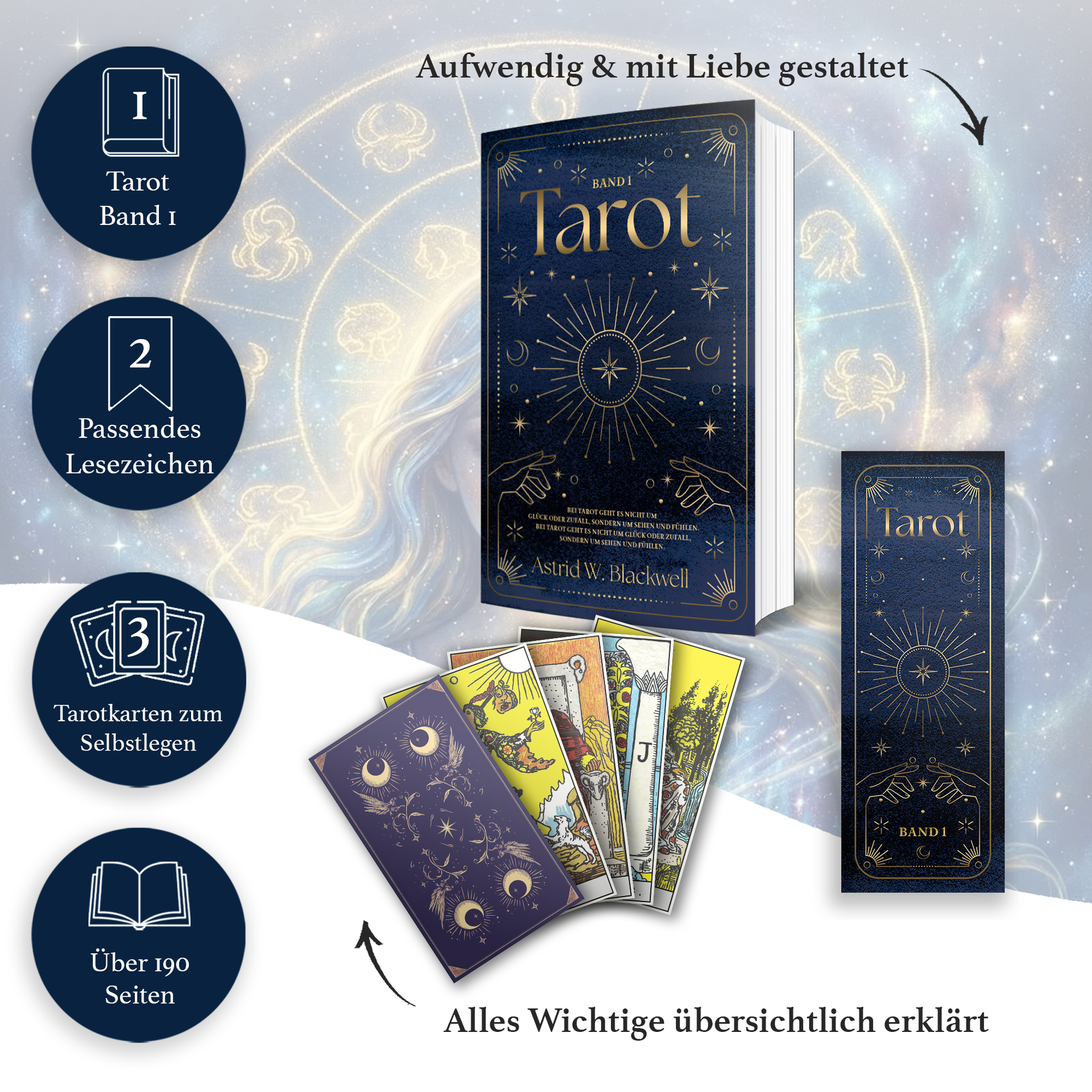 Mit den passenden Tarotkarten kannst du das Gelesene unmittelbar in die Praxis bringen – Karte für Karte, Zug um Zug. Das beiliegende Lesezeichen mit ausgewähltem Zitat begleitet dich dabei als stiller Impuls zwischen den Seiten. So entsteht ein Zusammenspiel aus Sehen, Lesen und Legen.